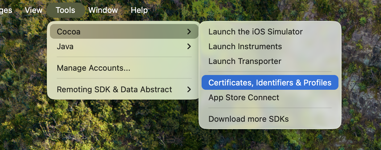 The first thing you'll need to do is go to "Certificates, Identifiers & Profiles" on Apple's developer website and set up a few things. That page is handyly available right from the "Tools" menu in Fire: