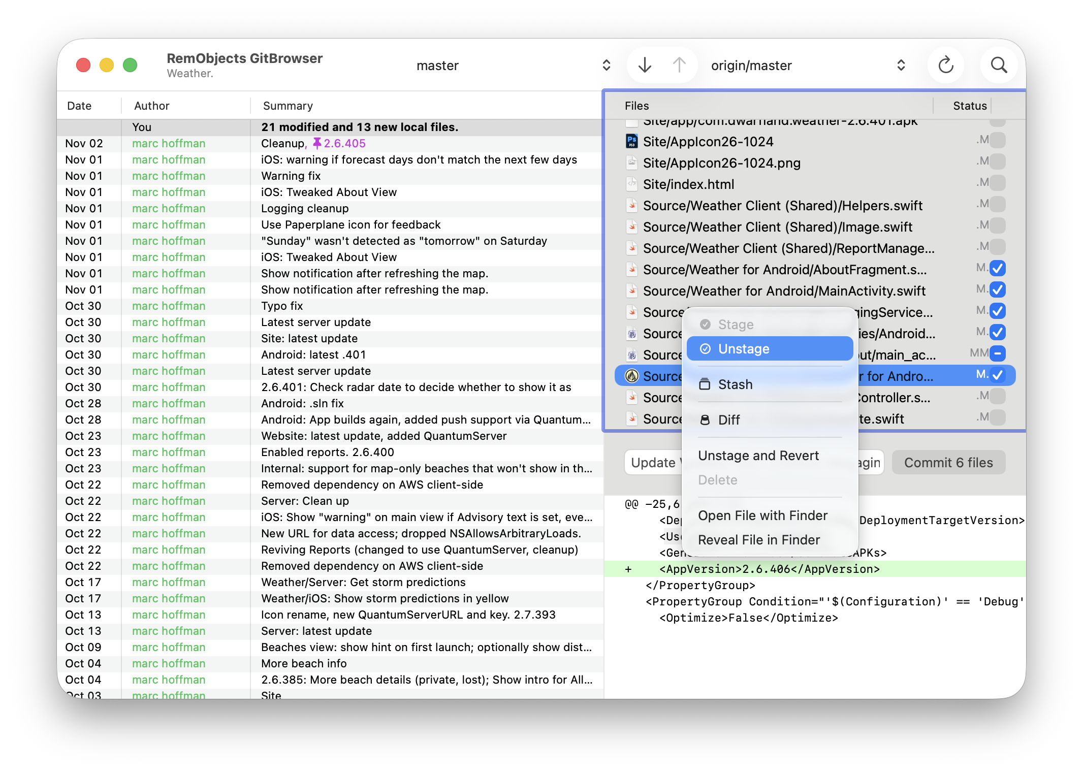 If you select a file, you will see the local changes in the embedded diff view at the bottom, just as before. This make sit really easy to double-checkl them all before staging – a practice i highly recommend.And of course you can double-click the file to open itn in Araxis Merge or BBEdit, to explore the diff in more detail.