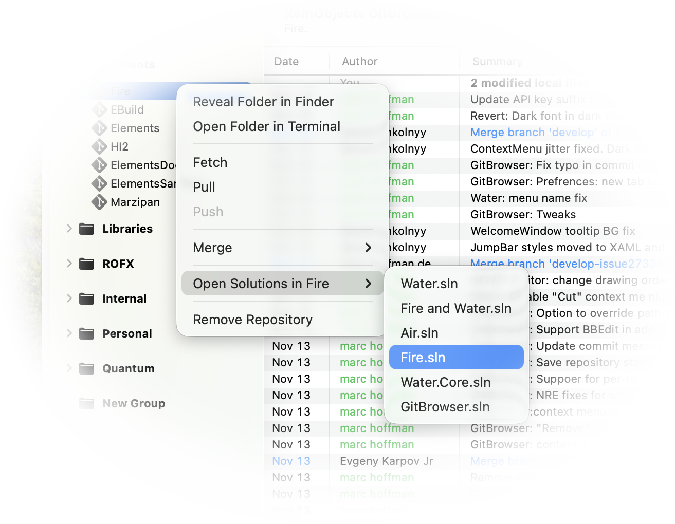 - GitBrowser finds Elements solutions in your repository and lets you easily open them in Fire from the context menu in the sidebar.