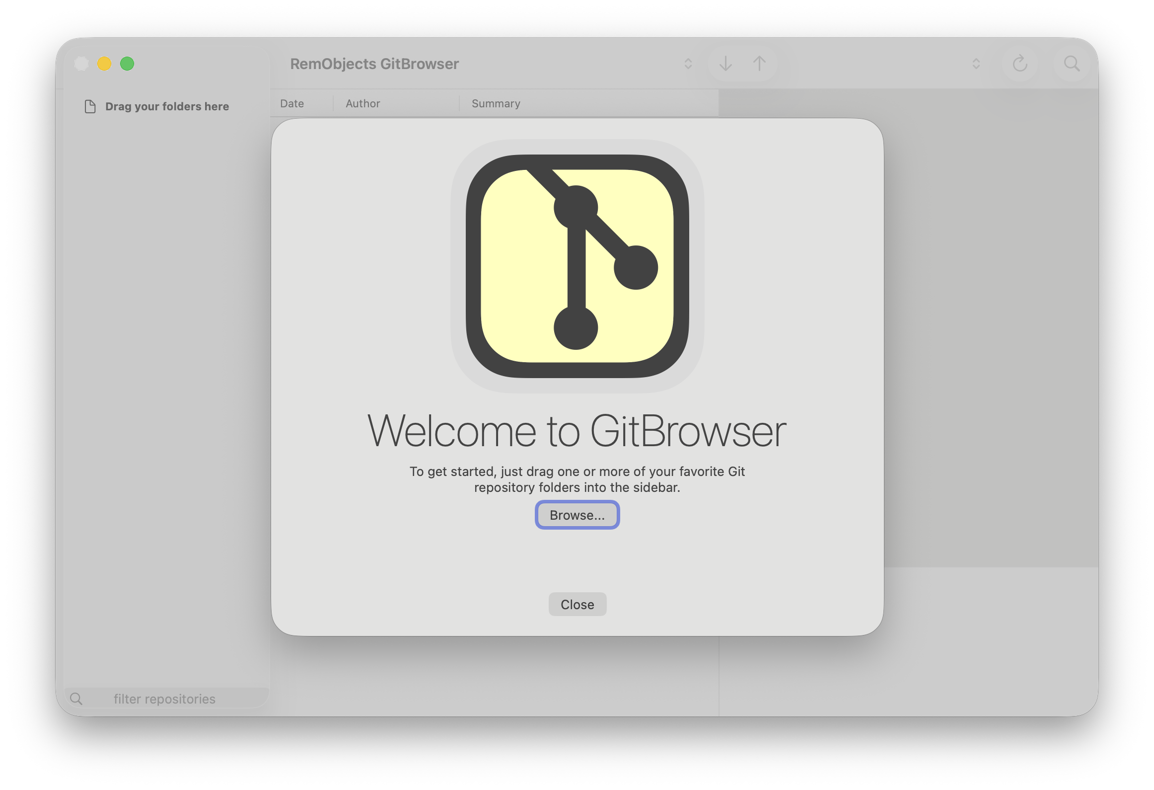 When you first start GitBrowser, it will ask you to add one or more local Git repositories to it. You can do so with the "Browse..." button on the Welcome sheet, or you can drag your folders in from Finder (or anywhere else) to the sidebar, at any time.